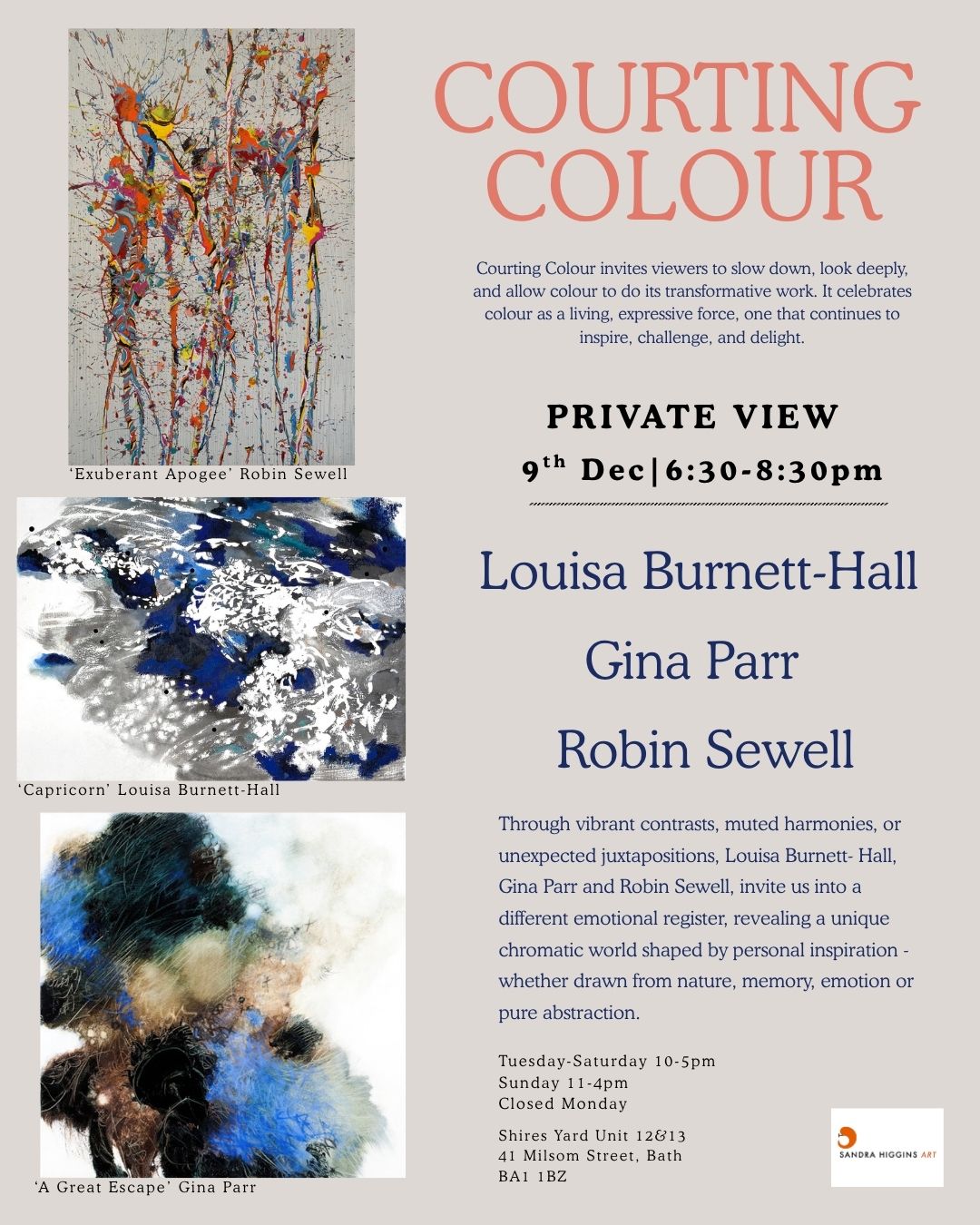 This exhibition, Courting Colour, invites viewers to slow down, look deeply, and allow colour to do its transformative work. It celebrates colour as a living, expressive force, one that continues to inspire, challenge, and delight everyone. Through vibrant contrasts, muted harmonies, or unexpected juxtapositions, Louisa Burnett- Hall, Gina Parr and Robin Sewell, invite us into a different emotional register, revealing a unique chromatic world shaped by personal inspiration – whether drawn from nature, memory, emotion or pure abstraction.