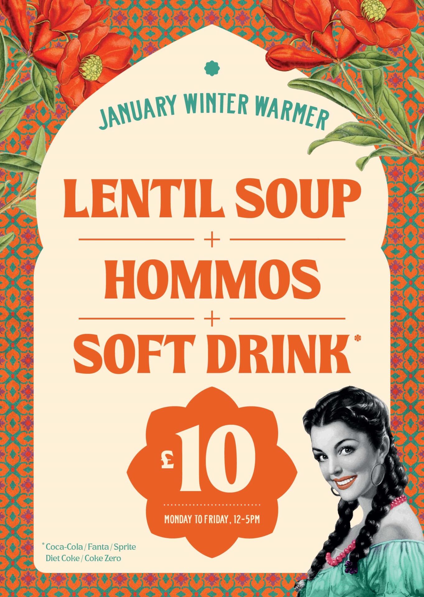 For a quick and healthy lunch, why not try Comptoir’s winter warmer deal? Enjoy a hearty bowl of lentil soup, creamy hommos, accompanied by a flatbread & a refreshing soft drink – all for just £10.
