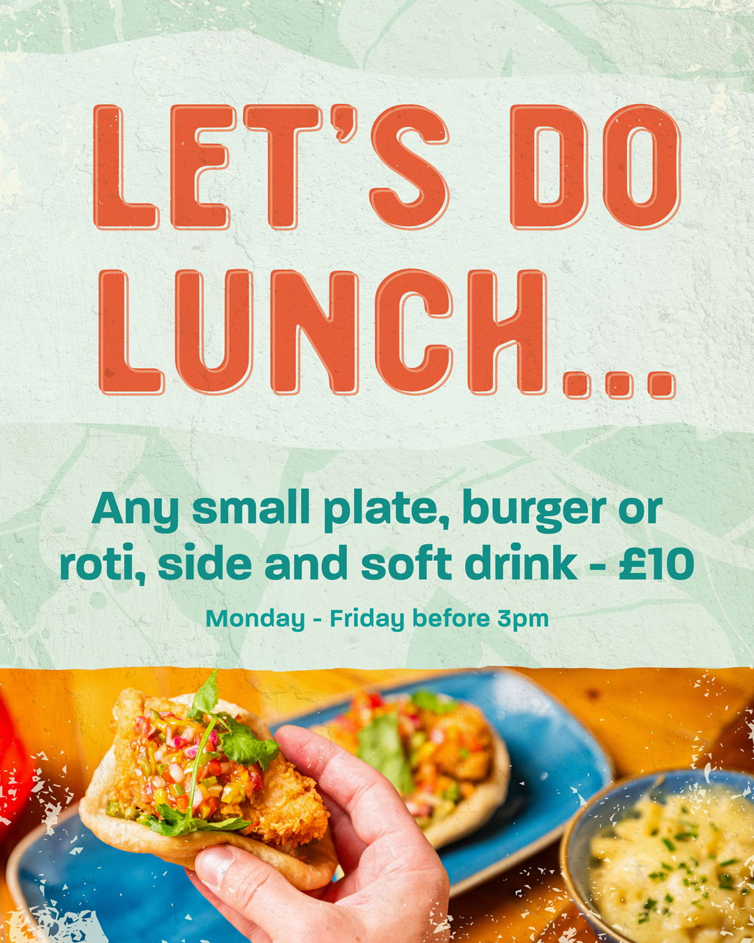 Enjoy a new delicious lunch offer at Turtle Bay this January. This offer consists of any small plate, burger or roti with any side and soft drink for £10.