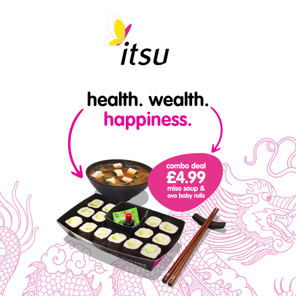 For those in need of nourishment, itsu has launched a new winter combo that ticks all the boxes, health. wealth. happiness: the avo baby rolls and miso soup deal at less than £5.