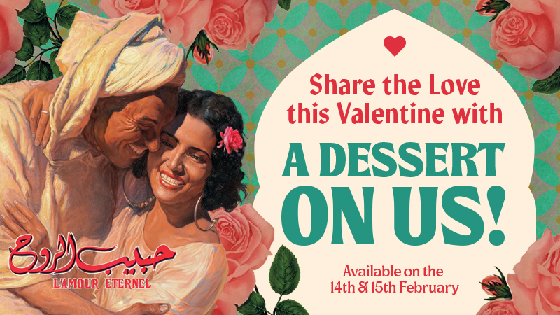 A complimentary dessert, subject to a minimum of two guests ordering one mezze and one large plate each. Available at all Comptoir Libanais UK restaurants excluding Stansted. Available for online bookings on 14th and 15th of February 2025 when dining in from the main menu. Not available in conjunction with any other offer. Not available on takeaway, delivery, order at table and click & collect orders.